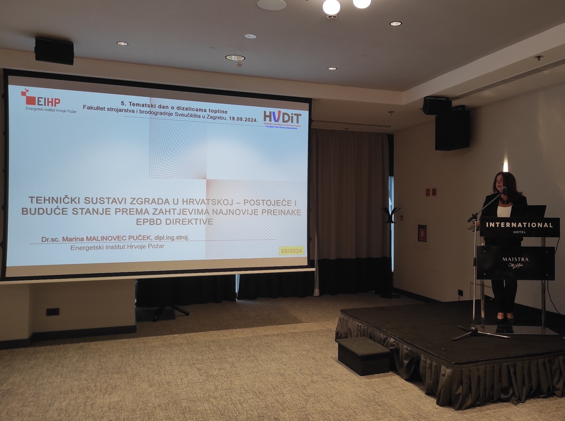Prvi blok predavanja zaključila je dr. sc. Marina Malinovec Puček s Instituta Hrvoje Požar s temom utjecaja preinaka EPBD direktive na tehničke sustave zgrada u Hrvatskoj koje će u skoroj budućnosti zgrade s nultim emisijama. Osim izmjena direktive, izlaganjem je obuhvaćen osvrt na potrošnju energije u Hrvatskoj te provedene aktivnosti cjelovite obnove zgrade EIHP i osnivanja nacionalnog trening centra za zgrade gotovo nulte energije.