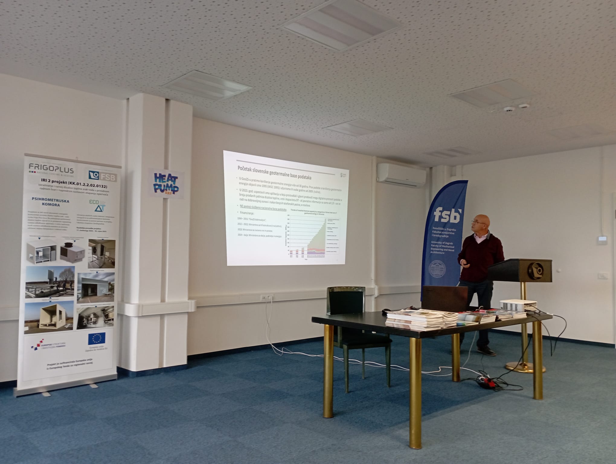 U prvom bloku predavanja uvaženi gost Dušan Rajver iz Geološkog zavoda Slovenije prezentirao je razvoj i iskustva primjene plitke geotermalne energije u Sloveniji te stručna i istraživačke aktivnosti Zavoda. Usporedba sa zemljama iz okruženja ukazala je na značajno manje korištenje ovakvih sustava u Republici Hrvatskoj. Blok o plitkoj geotermalnoj energiji zaokružili su prof. Tomislav Kurevija i doc. Marija Macenić s Rudarsko-geološko-naftnog fakulteta, prezentirajući vlastita iskustva te tri aktivna istraživačka projekta koji između ostalog za cilj imaju razvoj alata za podršku pri projektiranju ovakvih sustava te razvoj akcijskih planova za razvoj tržišta.